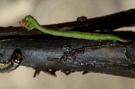 Very high-quality photos of all stages of this behavior are at: http://Hawaiianforest.com/wp/Hawaiian-carnivorous-caterpillar-eupithecia/.