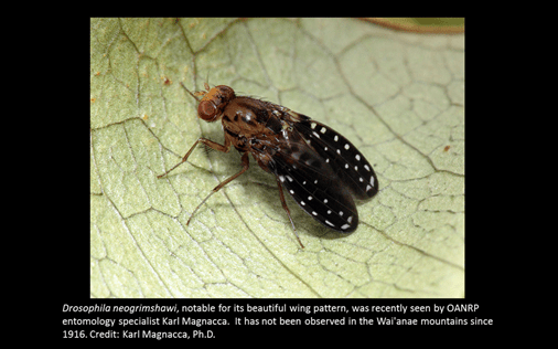 It is estimated that 800 or more native Drosophilid species are in Hawaiʻi and the evidence indicates that they all evolved from a colonization by a single species! It is one of the most spectacular examples of evolutionary radiation known in Hawaiʻi and anywhere. About a quarter of the world’s known species of about 4,000 species in Drosophilidae are endemic to Hawaiʻi. A summary of the Drosophilid story and the extraordinary radiation of this group in Hawaiʻi is available here: https://www.nap.edu/read/10865/chapter/7#15.