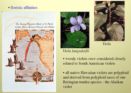 An example of the origin of the Hawaiian species of Viola in which the original species was likely transported by birds, as depicted in the presentation in the K. Systsma course is below.