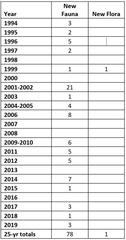 The records of the Hawaiʻi Biological Survey for each year show that species are still being routinely discovered, almost all of which are animals. Fungi are not reported. The report is here: http://hbs.bishopmuseum.org/pubs-online/pdf/op129p1-2.pdf. Totals for new species discoveries of fauna and flora by year from the summary table in the report are in the table below.