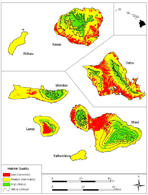 Habitat quality on the main Hawaiian Islands are shown below as depicted in the report Mapping Plant Species Ranges in the Hawaiian Islands—Developing a Methodology and Associated GIS Layers, Price et al. (2012): https://pubs.usgs.gov/of/2012/1192/. The website includes a separate file with a table of all plant species each species with a link to a map and a zip file with all the GIS files.